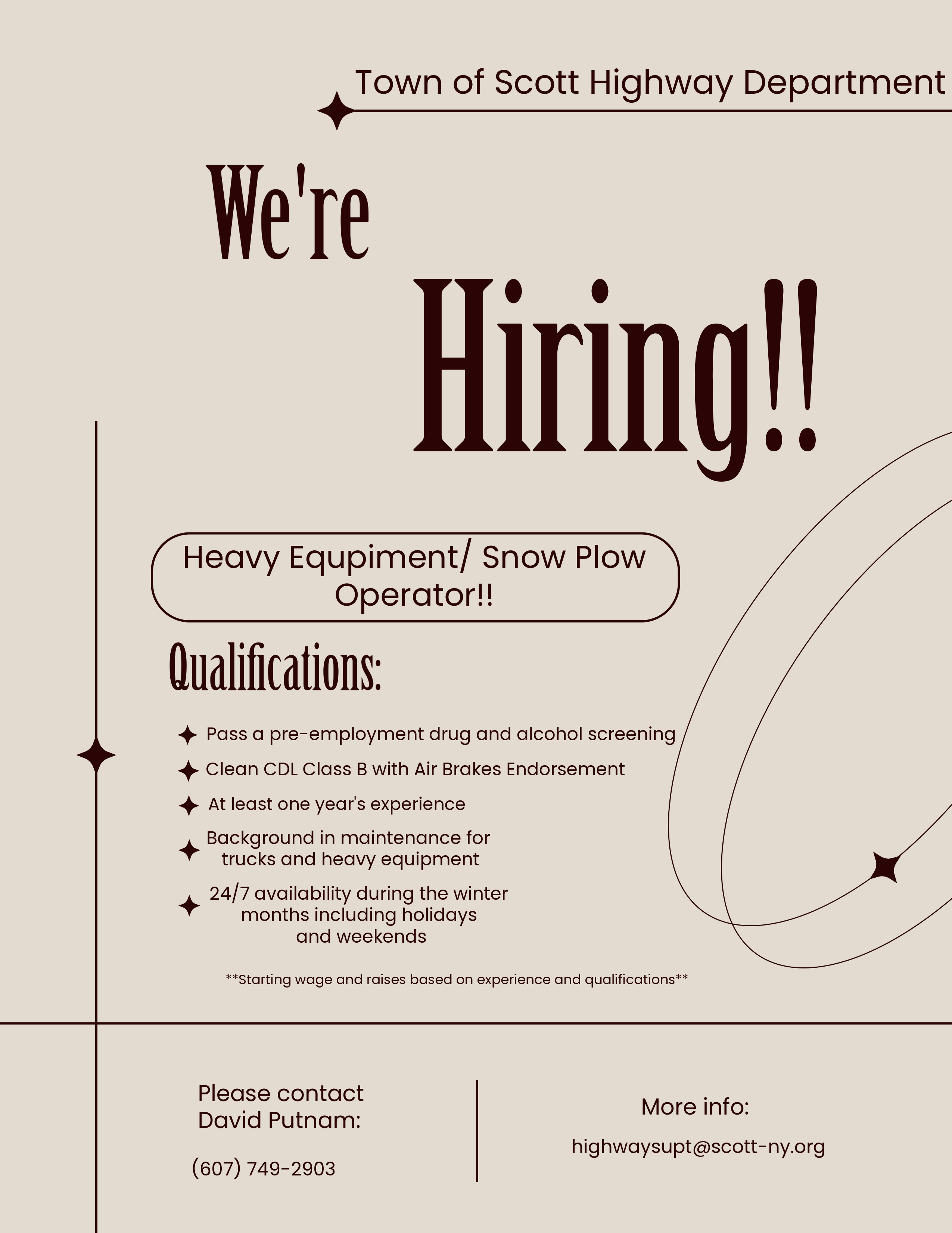 snowplowThe Scott Highway Department maintains 28 center line miles of road. Along with road maintenance for the town, employees also help in the development of the Andrew R. Fuller Recreational Park located on the south end of Skaneateles Lake. With the assistance of the Cortland County Legislature, the highway department also works during the town’s annual “Amnesty Weekend” which consists of accepting unwanted metals, white goods and unwanted “junk” from all town residents. The highway department consists of the elected Highway Superintendent, two full time employees and one part time summer employee.